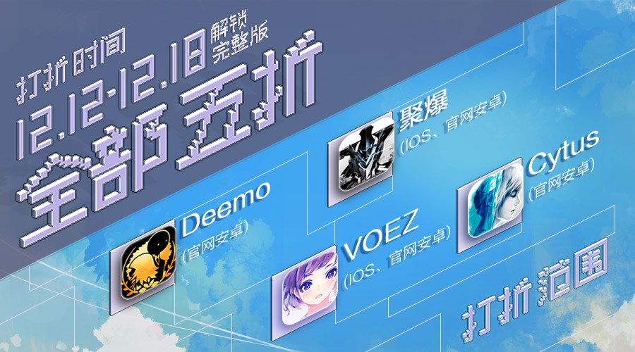 本次的(de)半價促銷活動于12月(yuè)12日(rì)中午12:00開(kāi)始,∏↔α"12月(yuè)18日(rì)中午12:00結束。打折作¶₽¶∞(zuò)品為(wèi)《Deemo》《Cytus》《聚爆》《蘭空(kōng)Voez典藏版》這(zhè)₽$>₩四款遊戲的(de)“官方網站(zhàn)”版本。具體(tǐ)打折範圍如(rú)下(xià):®≠